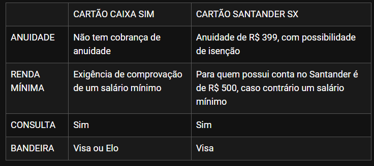 | Característica | Cartão Caixa Sim | Cartão Santander SX |