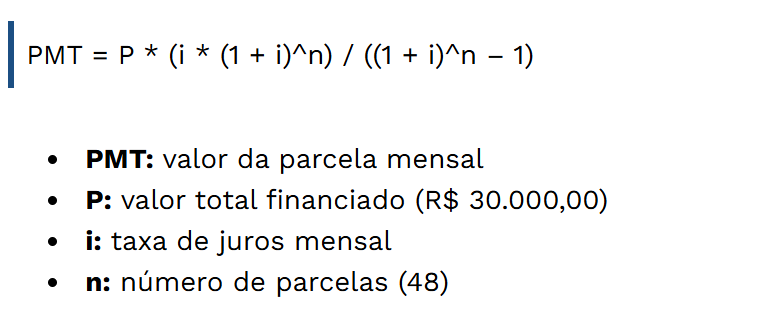 O valor da parcela de um financiamento de R$ 30.000 em 48 vezes depende da taxa de juros aplicada. Com base em simulações comuns, os valores médios das parcelas podem variar conforme a taxa de juros mensal: